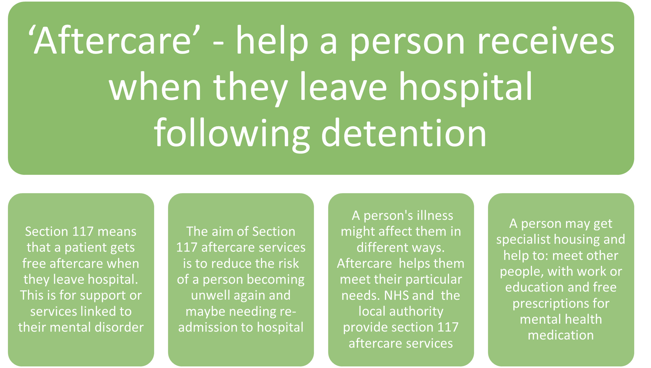 Aftercare cannot be withdrawn simply because someone has been discharged from specialist mental health services, or an certain period has passed, or they have been returned to hospital and / or further detained under MHA and / or Mental Capacity Act (MCA).